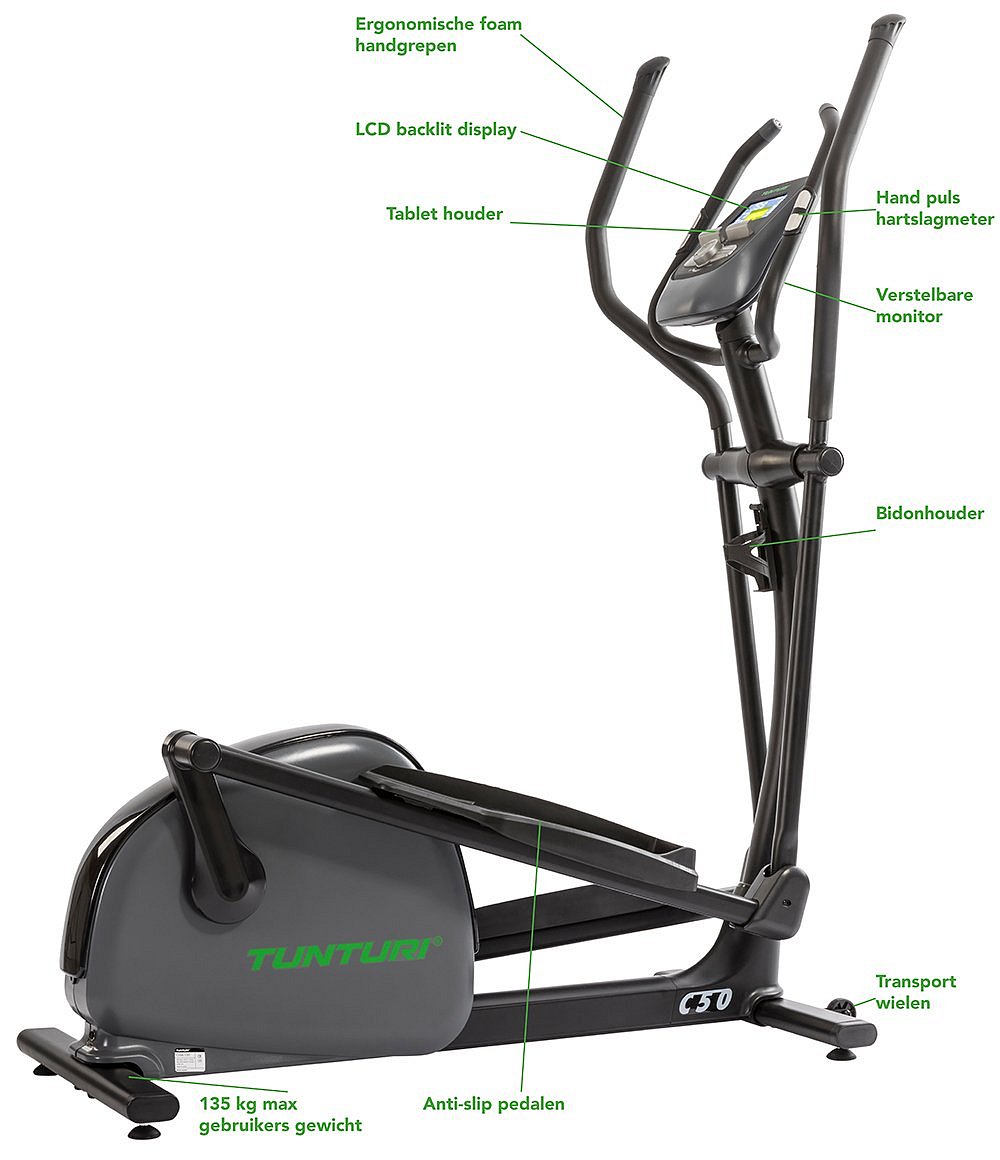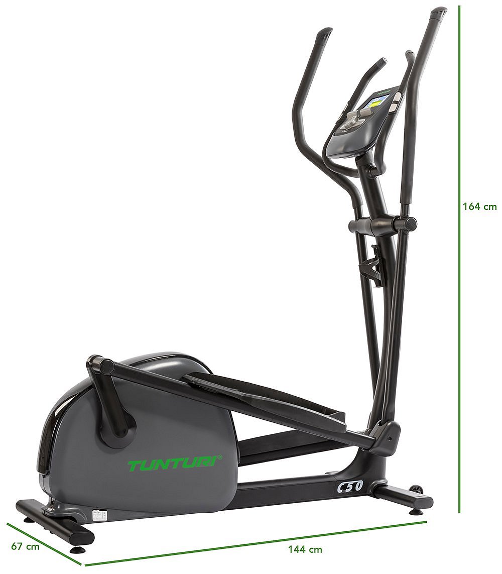 Eliptický trenažér TUNTURI Performance C50 se setrvačníkem v zadní části stroje nabízí zákazníkům kombinaci kvalitní mechaniky a ergonomie rámu s nosností až do 135 kg. Stroj disponuje standardně dlouhým krokem o délce 42 cm a díky optimální ergonomii je zaručen pohodlný a správný pohyb jak drobným, tak vyšším postavám. Stabilní a masivní konstrukce spolu s kvalitními komponenty zaručuje dlouhou životnost stroje a předurčuje model pro pravidelný trénink.