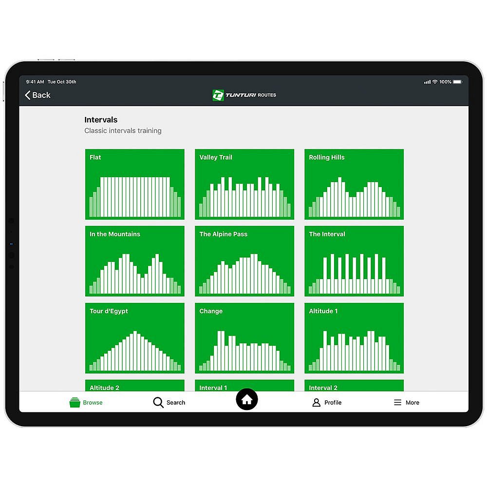 U modelu TUNTURI E60 Performance s přehledným podsvětleným 5,5" LCD displejem je programová nabídka velmi bohatá. Na výběr je zde 21 přednastavených tréninkových programů, včetně HRC programu řízeného podle aktuální tepové frekvence a mnoho dalšch vychytávek (Fitness test, Recovery). Pokud si chcete váš trénink opravdu užít, propojte rotoped s aplikacemi TUNTURI Routes, iConsole+ nebo KINOMAP - z vašeho cvičení se tak stane nikdy nekončící zábava. Kdo by si nechtěl po ránu projet např. malebnými uličkami Francie.