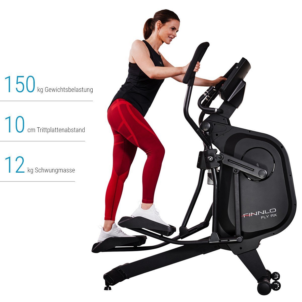 FINNLO FLY RX9 poskytuje přirozený pohyb, a to díky nastavitelné délce kroku 45 - 55 cm a rozteči protiskluzových nášlapů 10 cm. Součástí stroje je i držák na lahev. Stabilitu při každém tréninku zajistí vyrovnávače nerovností podlahy. Transportní kolečka umožní snadnou manipulaci se strojem kamkoliv v prostoru.