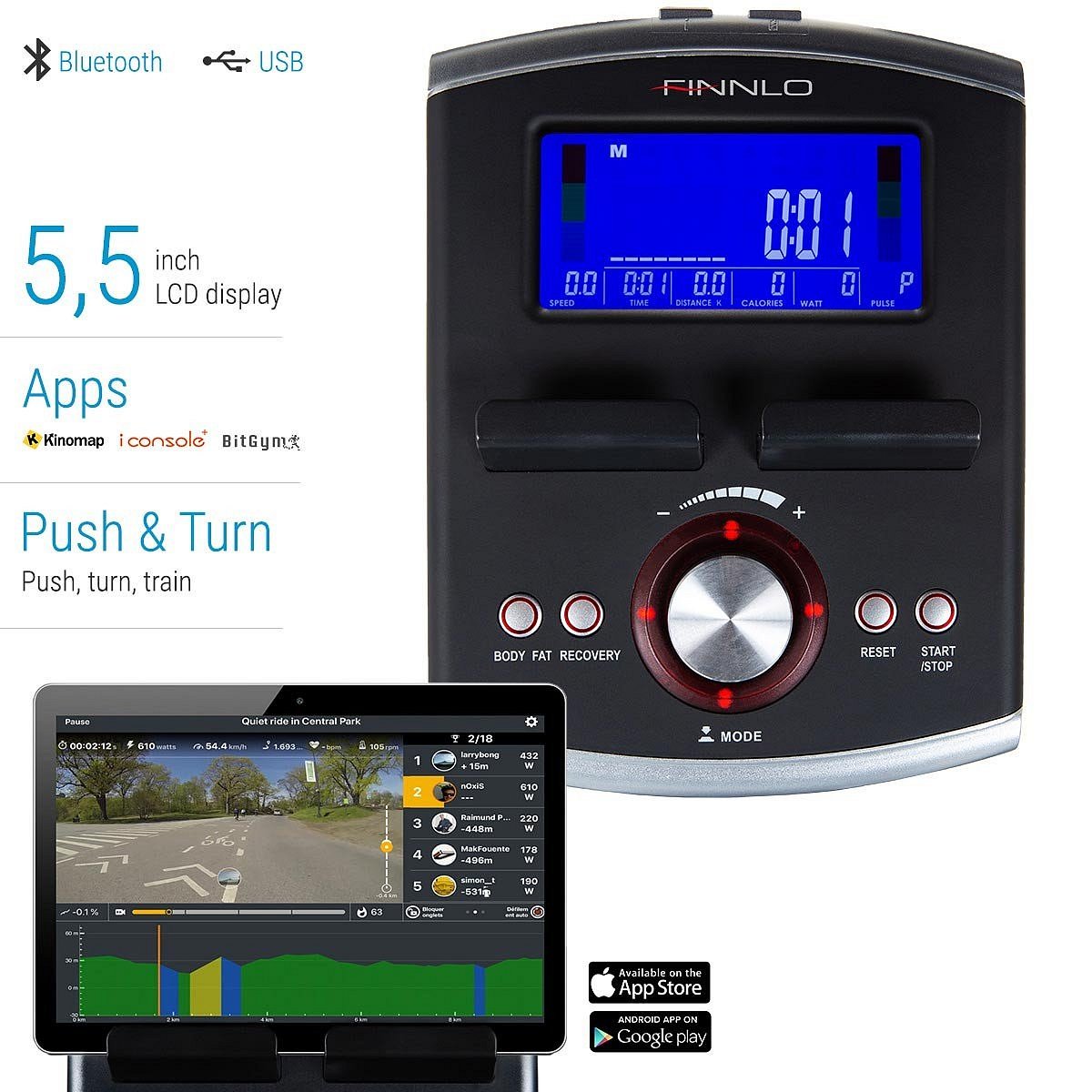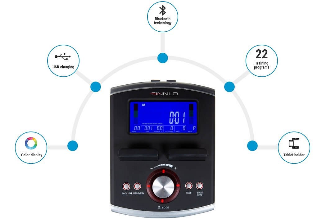 Finnlo CleverFold CF70 BT je vybaven přehledným počítačem s LCD displejem, který zobrazuje všechny důležité hodnoty při tréninku. Součástí je i držák na tablet/smartphone, USB port pro nabíjení a Bluetooth zařízení.