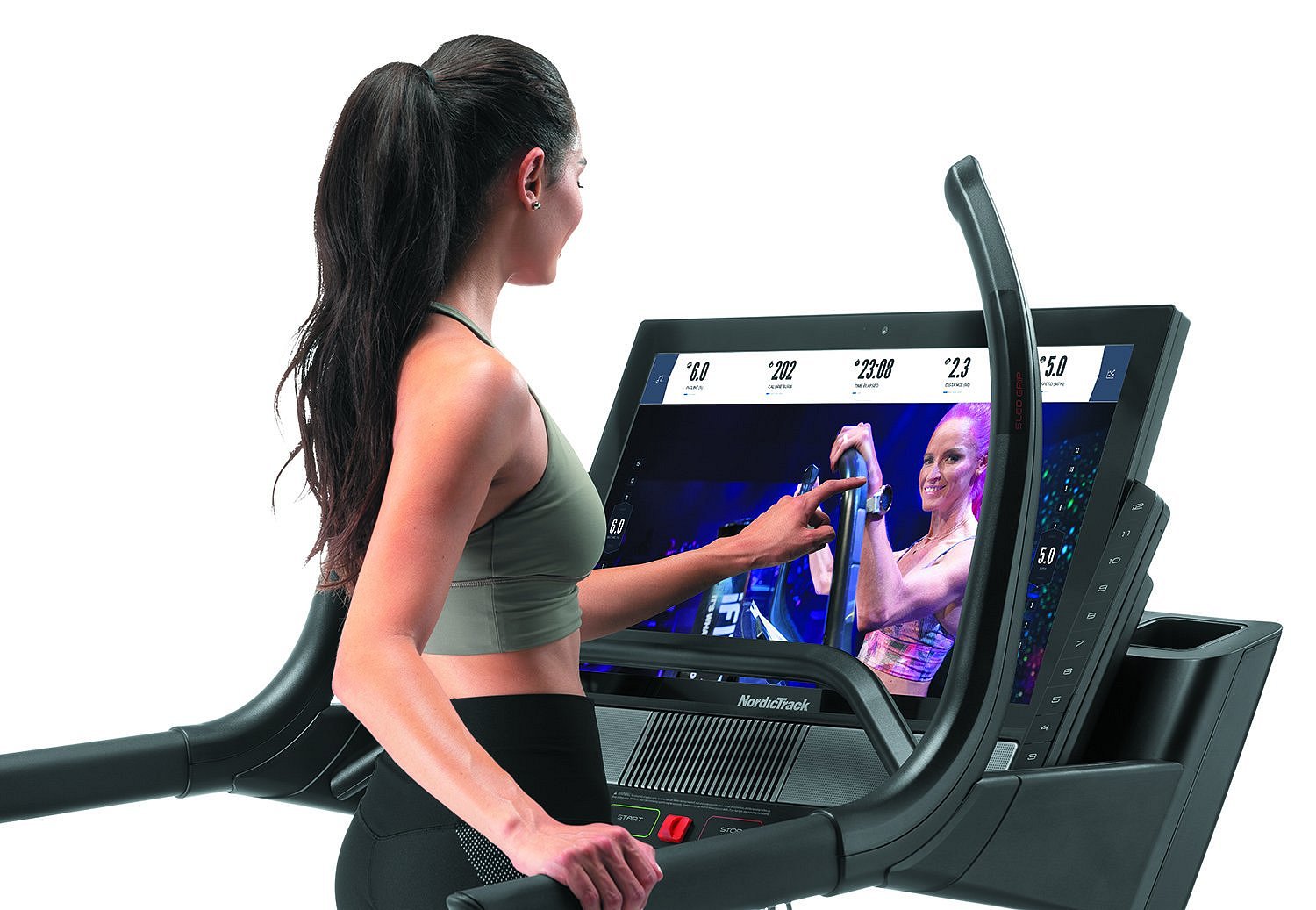 Počítač má 31,5" vysokokontrastní dotykový displej pro sledování běžných tréninkových hodnot. Zobrazované parametry jsou: rychlost, čas, vzdálenost, spálené kalorie, tepová frekvence. Dále je v nabídce 50 tréninkových programůPro měření frekvence tepu je nutné připojit kompatibilní Bluetooth hrudní pás, který provádí měření s přesnosti EKG. Hrudní pás je k zakoupení na našem e-shopu. Součástí konzole jsou úchyty "SLED GRIPS" pro tzv. tlačení saní, jako při tréninku crossfitu nebo "PUSH BAR" pro klasické odtlačování, které má za cíl maximalizovat sílu a dynamiku v těle. To vše za pomocí rozsahlého sklonu.