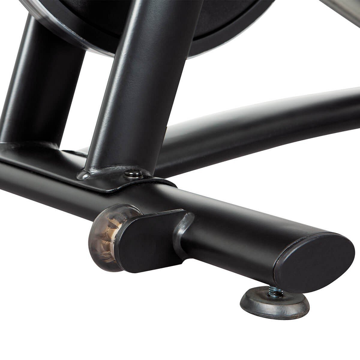V přední části jsou transportní kolečka pro jednoduchou manipulaci se strojem a samozřejmostí jsou i vyrovnávače nerovností podlahy pro stabilní polohu při každém tréninku.