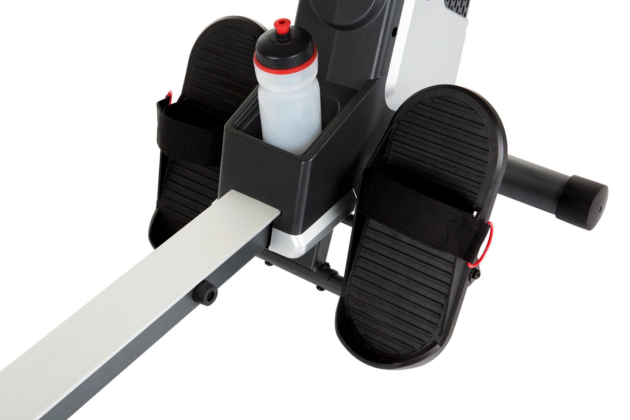 Pomocí nastavitelných popruhů na nohy si veslovací trenažér dokonale přizpůsobíte své postavě. Rozteč nášlapných desek 18 cm a výška sedadla 33 cm jsou ergonomicky navrženy. Praktický úložný box lze použít například na úzké láhve s pitím nebo jako držák na chytrý telefon.