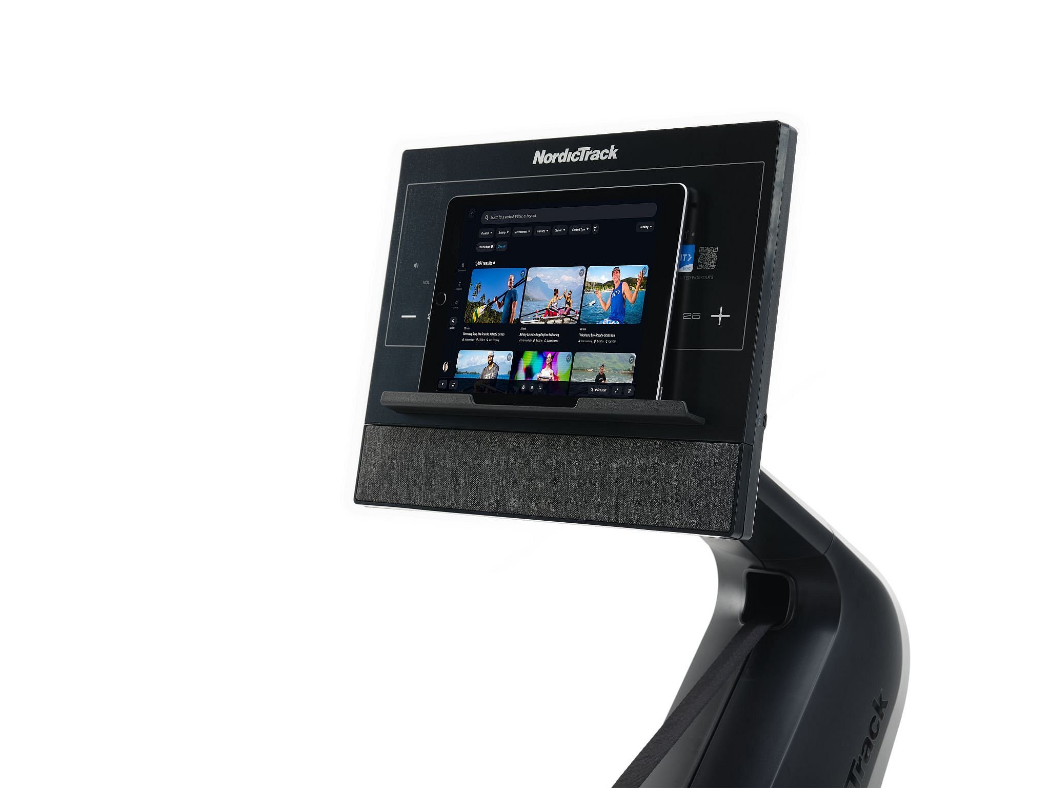 Na přehledném výklopném 5“ (12,7 cm) LCD displeji uvidíte živé statistiky tréninku. Nebo připojte své vlastní zařízení k iFIT a položíte jej na držák pro zařízení, abyste mohli sledovat trenéry iFIT při trénincích po celém světě.